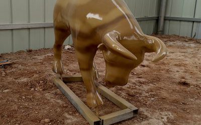 首先在泡沫或泥塑外分割、噴涂隔離劑制作石膏模具;模具凝固后卸下并清理、精修模具;然后刷樹脂膠、貼纖維布開始制作雕塑局部;待各個(gè)部分都制作好后拼裝到一起;最后打磨后進(jìn)行表面著色處理、噴涂清漆即可。